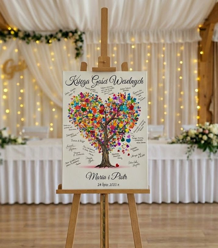 Księga gości Kolorowe Drzewo to połączenie tradycji z nowoczesną paletą barw. Personalizowany obraz na płótnie, który ożywi każde wnętrze, niosąc ze sobą ciepło życzeń od Waszych najbliższych.