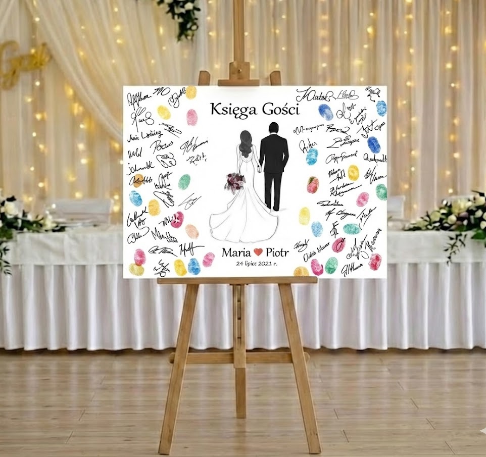 Szukacie pamiątki, która w pełni odda charakter Waszej pary? Księga gości Obraz Para Młoda to rozwiązanie, które łączy nowoczesną grafikę z interaktywną formą składania życzeń. Centralna postać Pary Młodej nadaje pamiątce tonu, a wolna przestrzeń wokół niej czeka na ciepłe słowa, uściski i dedykacje od najważniejszych dla Was osób. To obraz, który po weselu nie trafi do kartonu, lecz zajmie honorowe miejsce na ścianie Waszego salonu.