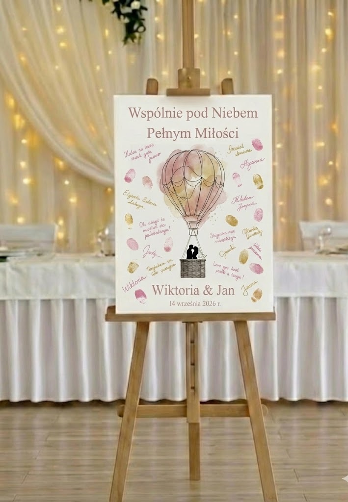 Księga Gości Akwarelowy Balon to malarska interpretacja Waszej wspólnej drogi. Personalizowany obraz na płótnie, gdzie ciepłe słowa i podpisy bliskich stają się wiatrem, który unosi Wasze marzenia wysoko do chmur.