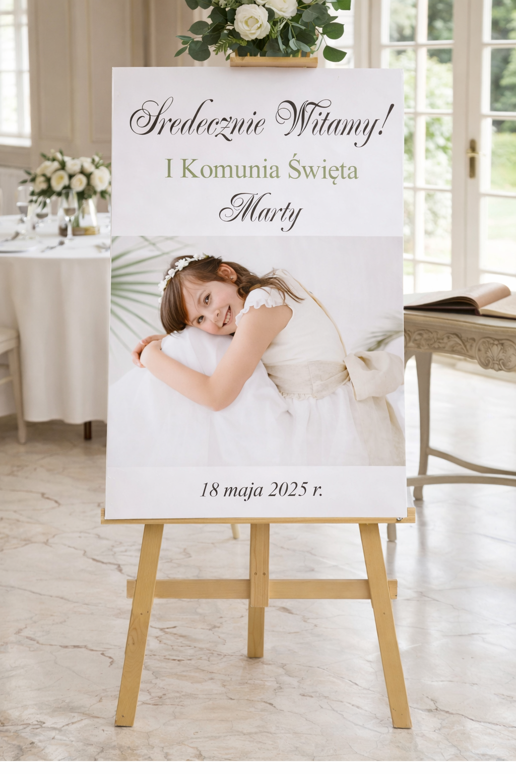 • Symboliczne Powitanie: Idealna dekoracja na sztalugę przed wejściem na salę, wprowadzająca gości w uroczysty nastrój.