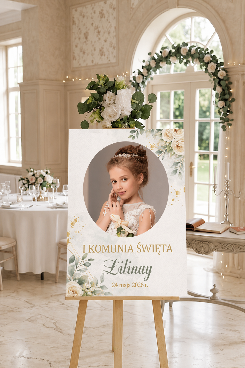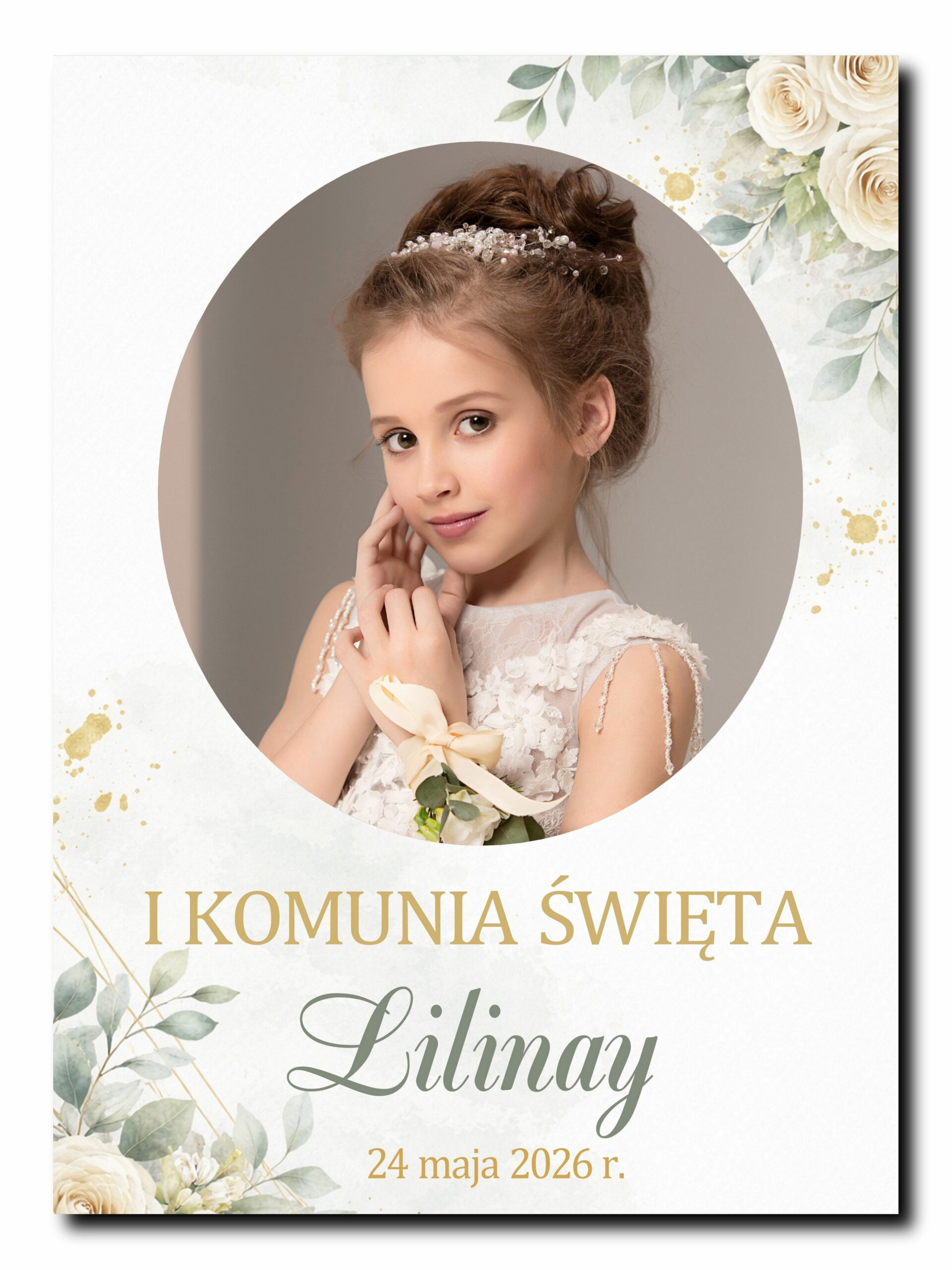 Projekt oparty na harmonii natury i nowoczesnego luksusu. Delikatne, kremowe róże oraz liście eukaliptusa tworzą eteryczną ramę dla fotografii dziecka, a złote linie geometryczne nadają całości współczesnego sznytu, idealnie wpisując się w trendy komunii dla dziewczynek.