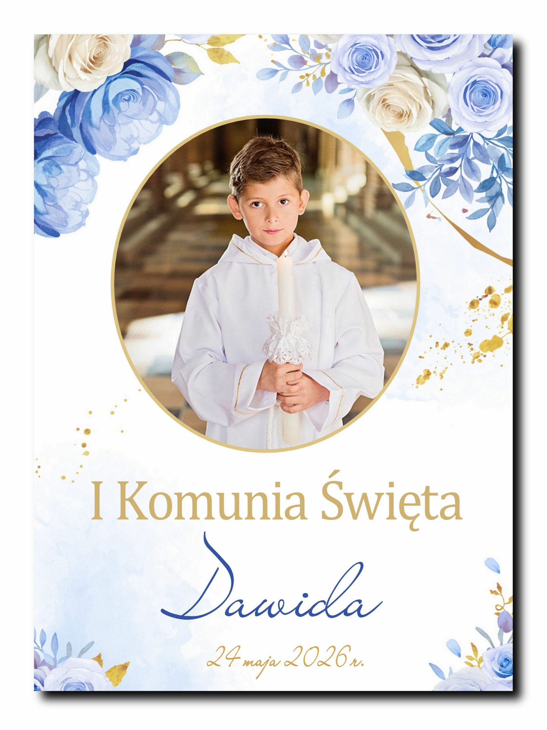 • Artystyczna Oprawa: Twoje zdjęcie wkomponowane w elegancki projekt z motywem akwarelowych, błękitnych róż i muśnięć złota.