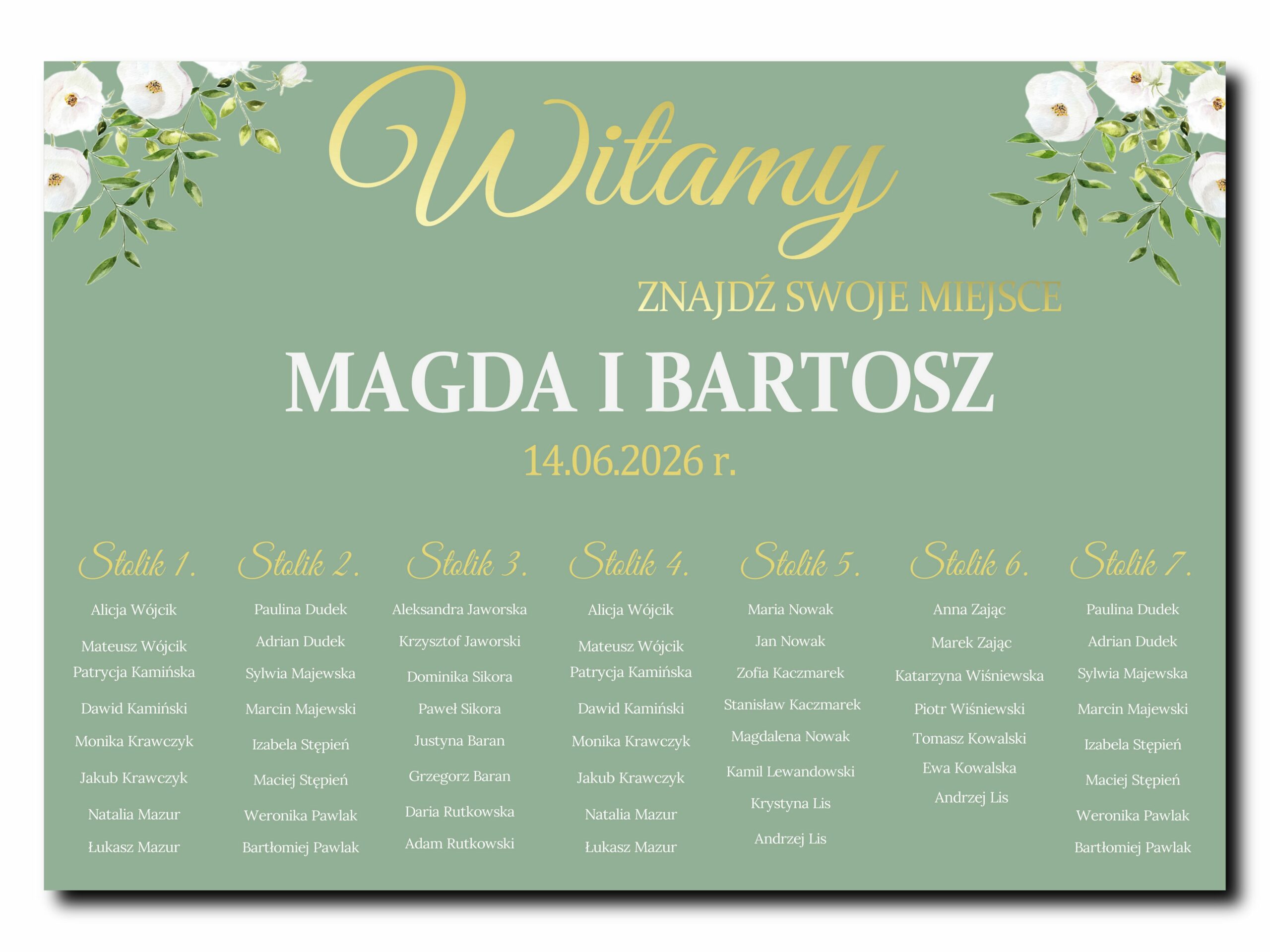 | Model Produktu | Tablica z Planem Stołów – Szałwiowa Zieleń i Białe Kwiaty |