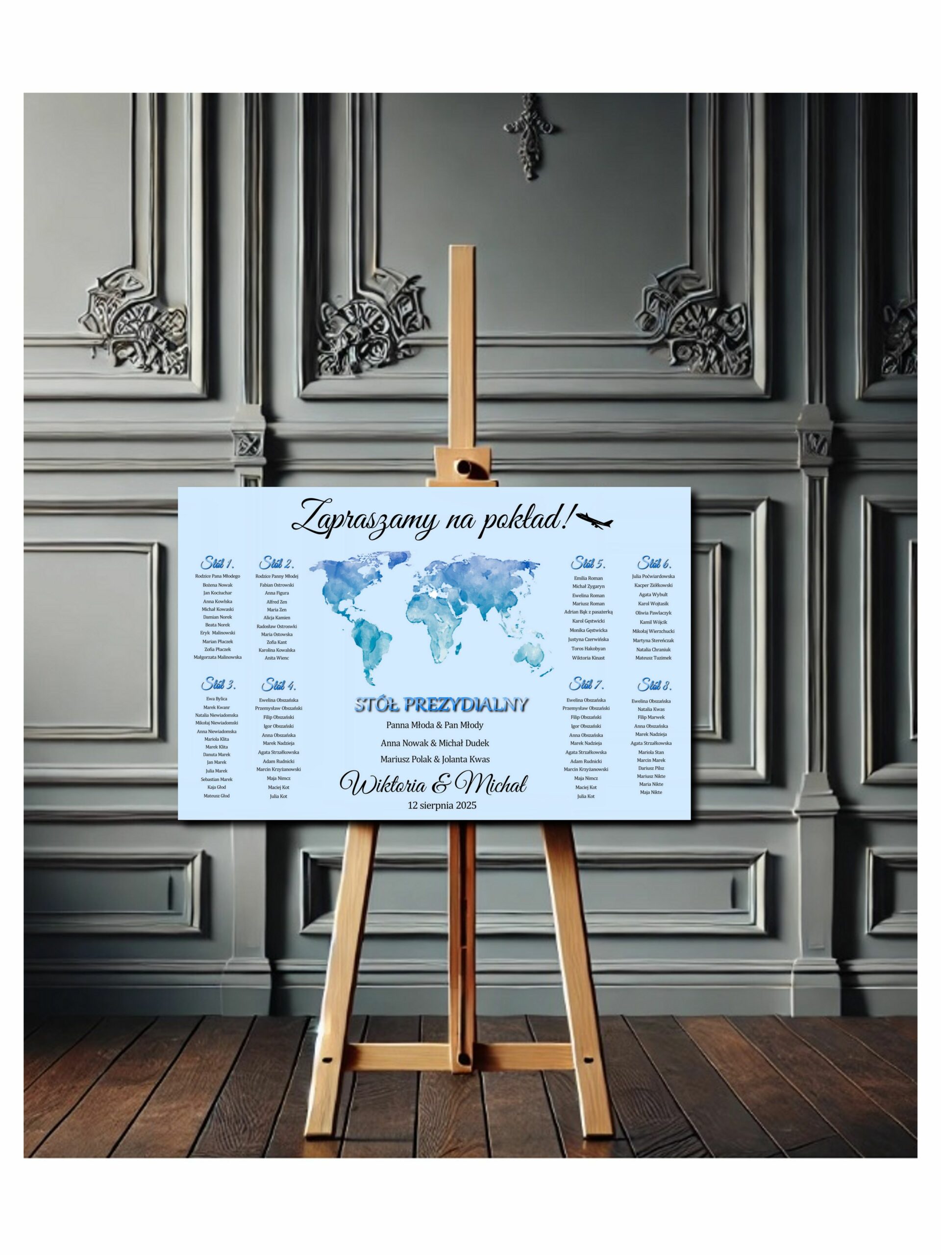 Centralnym elementem projektu jest akwarelowa mapa świata w odcieniach niebieskiego. Motyw podróży podkreśla hasło Zapraszamy na pokład! oraz subtelna grafika samolotu, co świetnie wpisuje się w aranżacje ślubów międzynarodowych, plenerowych czy w stylu travel. Wyróżniony stół prezydialny znajduje się w centrum, a dookoła rozmieszczone są czytelnie opisane stoliki z listami gości. Imiona Pary Młodej i data ślubu dopełniają całości, nadając tablicy indywidualny charakter.
