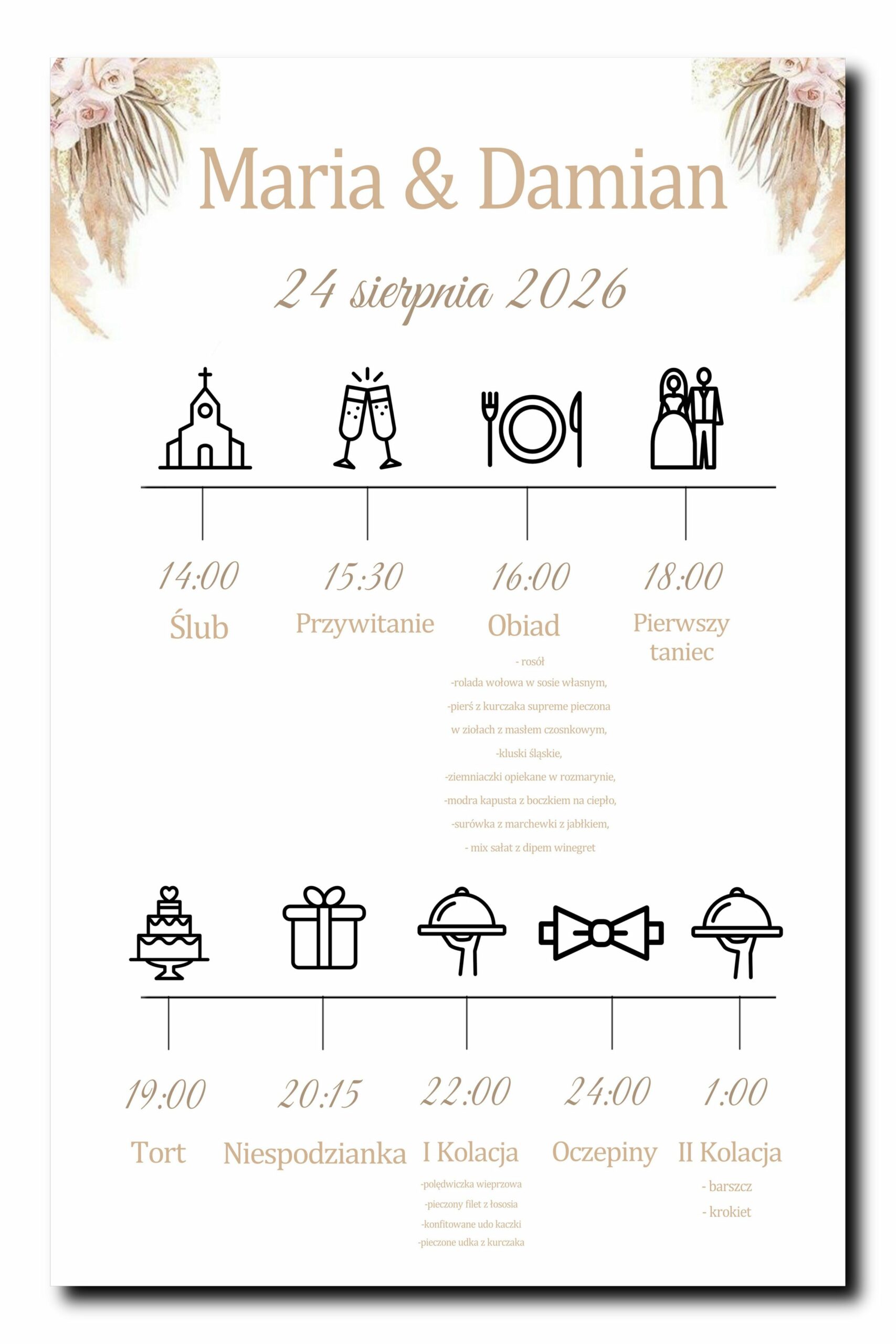 Wiedza o tym, co wydarzy się za chwilę, daje gościom ogromne poczucie komfortu. Personalizowana Tablica z Harmonogramem Wesela i motywem trawy pampasowej to niezastąpiony asystent każdego przyjęcia. Dzięki zastosowaniu uniwersalnych, nowoczesnych ikon (ikona kościoła, toastu, tortu czy oczepin), Wasi bliscy w mgnieniu oka zorientują się w planie uroczystości. Ten wyjątkowy projekt oferuje również miejsce na szczegółowe rozpisanie menu pod głównymi posiłkami. Wybierając luksusowy, sztywny obraz na płótnie, zyskujecie dekorację premium, która dumnie zaprezentuje się na sztaludze obok planu stołów.