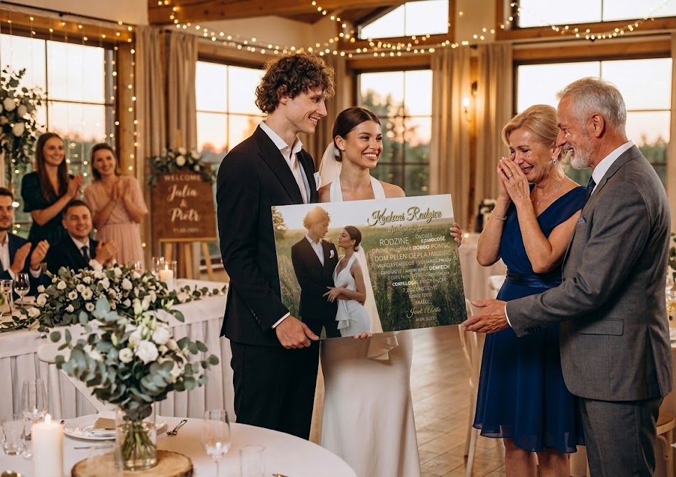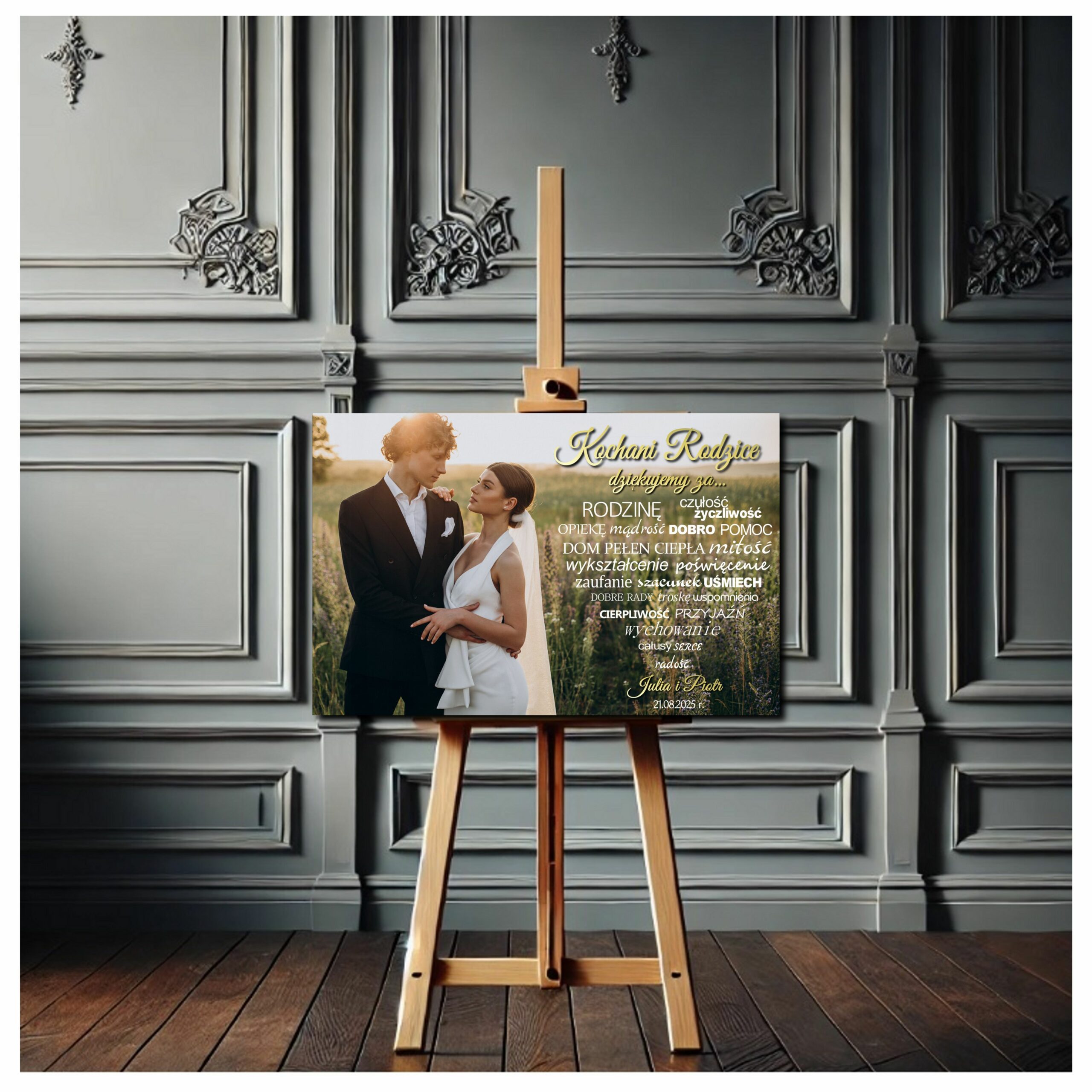 Są chwile, w których brakuje słów, by wyrazić całą wdzięczność za lata bezwarunkowej miłości. Personalizowany obraz podziękowania ślubne dla rodziców ze zdjęciem i sercem ze słów to nowatorska, niezwykle emocjonalna alternatywa dla klasycznych wierszy. Lewą stronę szerokiego, poziomego płótna wypełnia Wasza ulubiona fotografia z sesji narzeczeńskiej. Prawa strona to prawdziwe wyznanie miłości – chmura słów układająca się w kształt serca, dziękująca za wychowanie, cierpliwość, dobre rady, dom pełen ciepła i wiele więcej. Złote, eleganckie nagłówki nadają całości niesamowitego szyku. Wręczając ten sztywny fotoobraz, dajecie rodzicom gotową do powieszenia pamiątkę klasy premium.